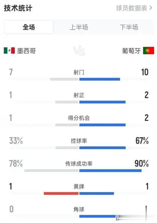 从技术统计看,葡萄牙占据了绝对主动:67%的控球率、90%的传球成功率、10次射门。但看似碾压的数据背后,是进攻组织的严重低效。